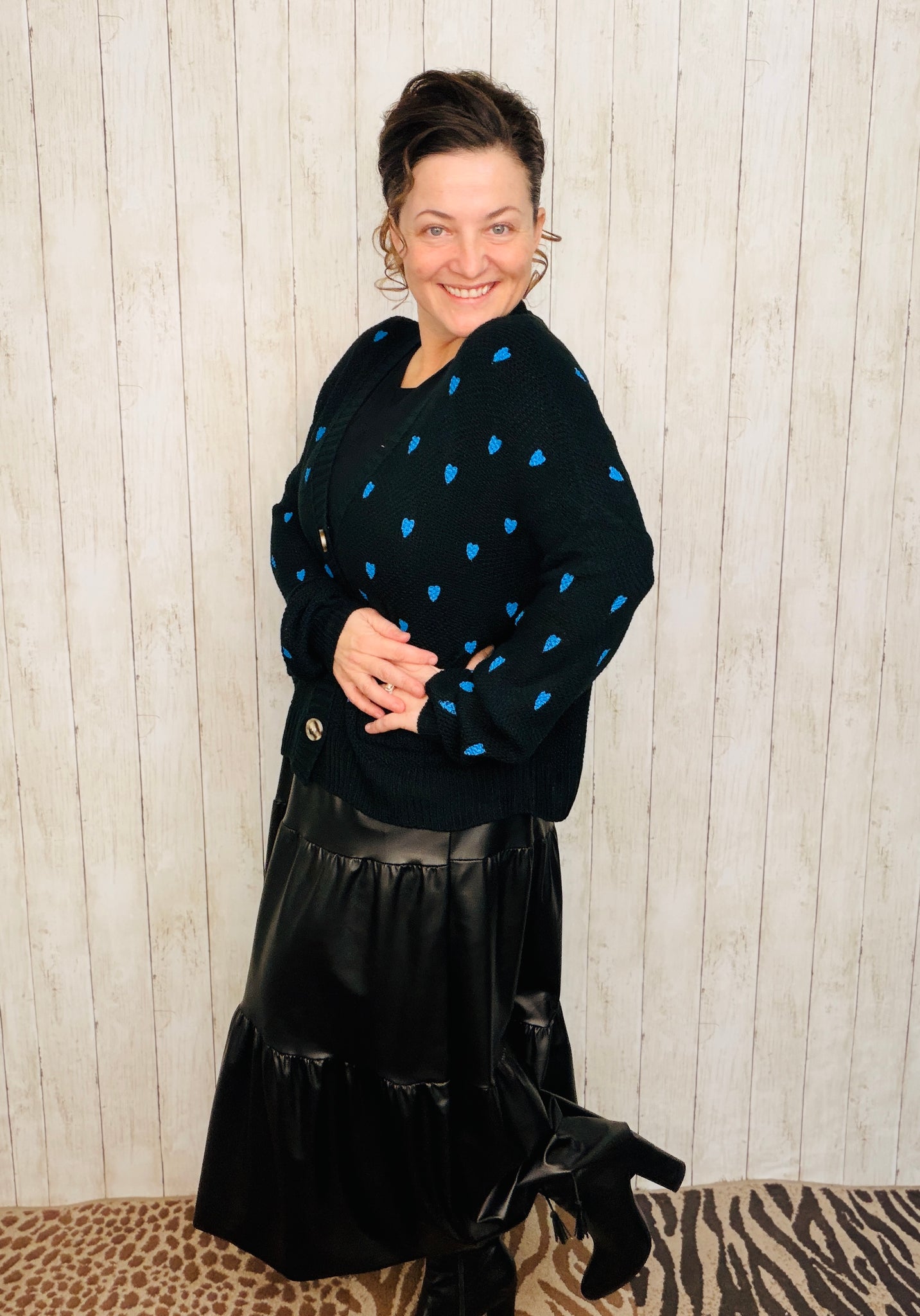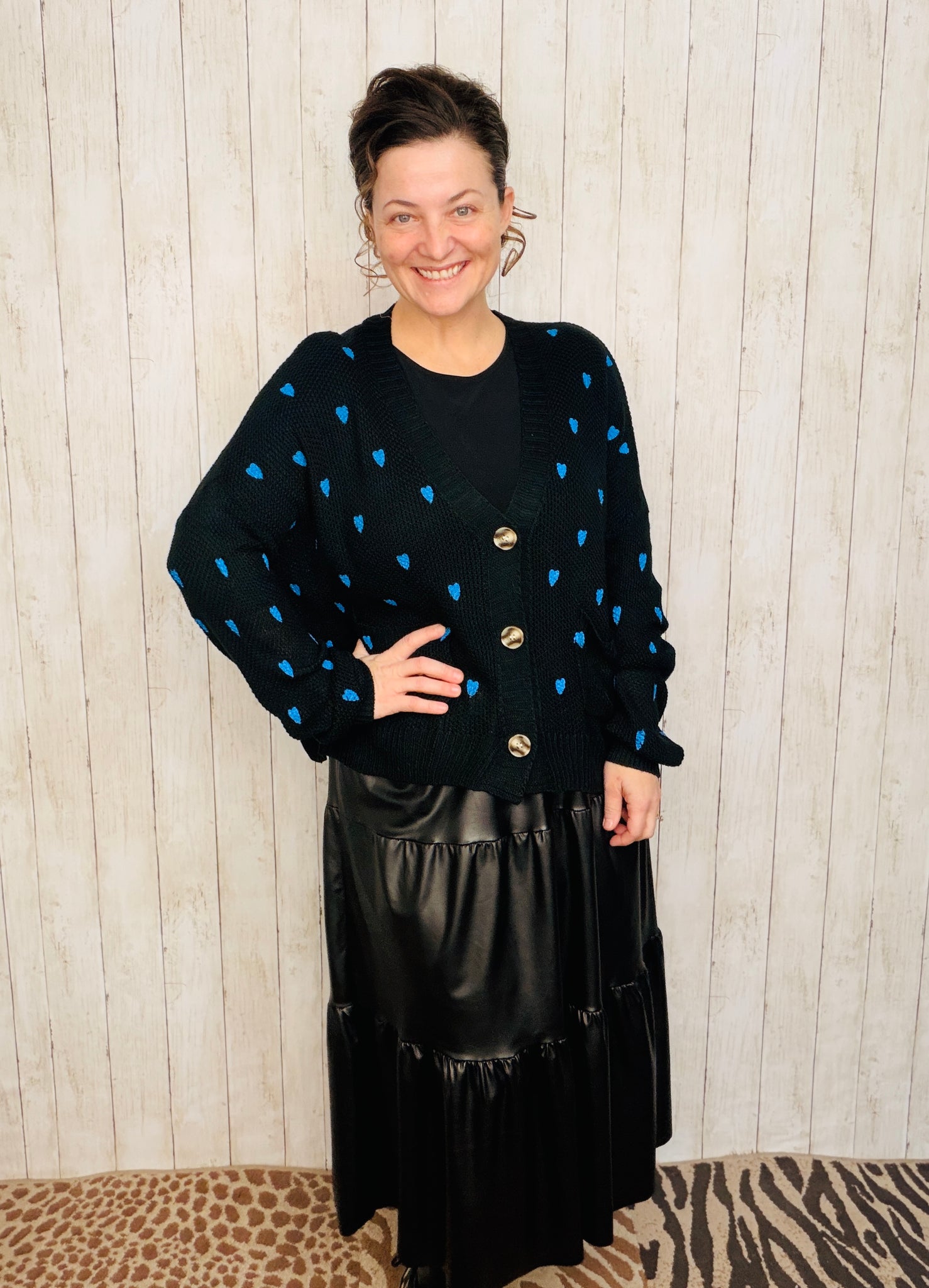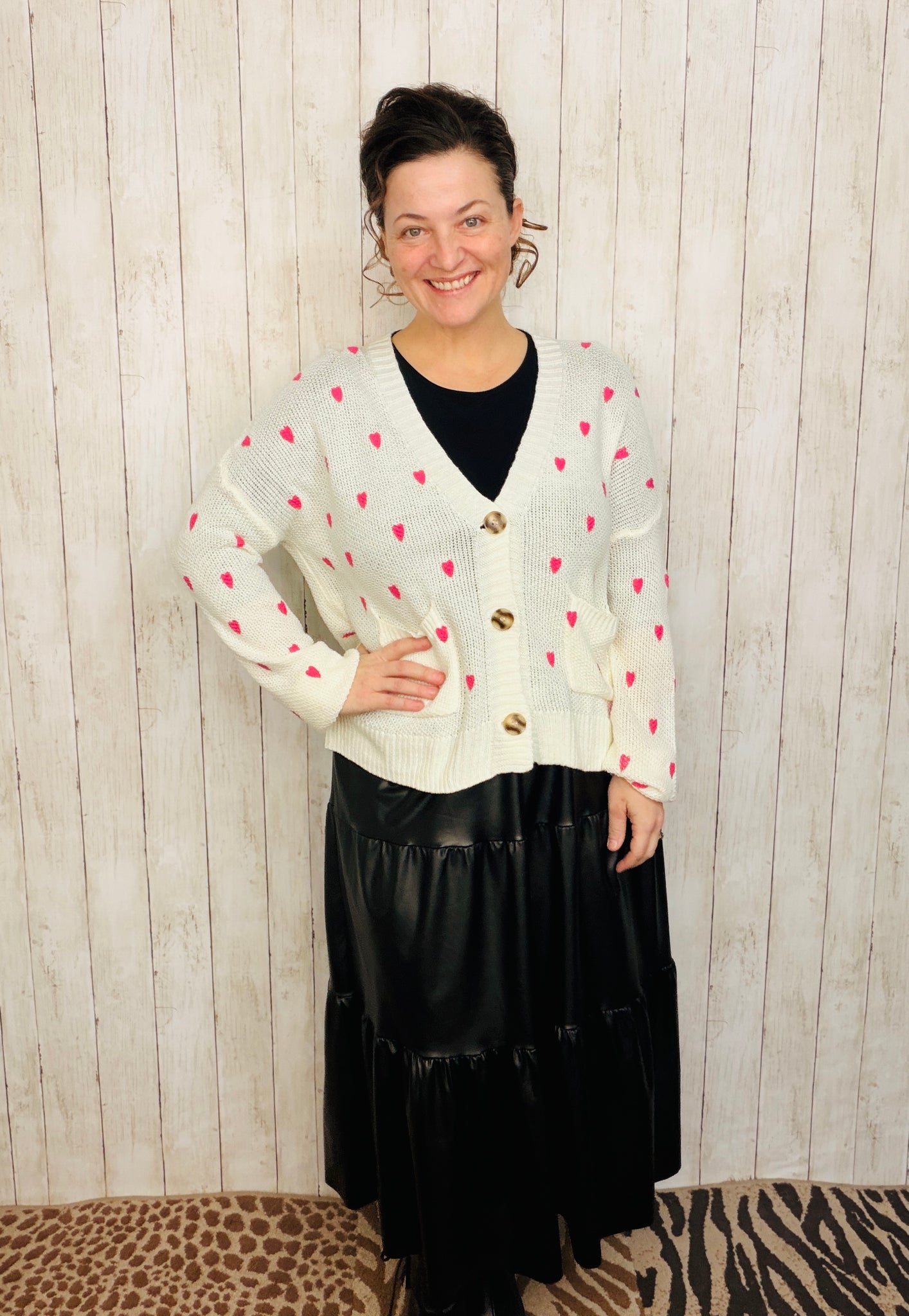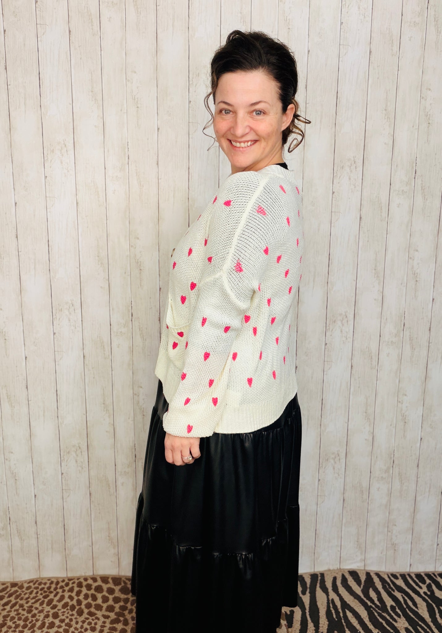 Elevate your everyday wardrobe with this charming cardigan, thoughtfully designed with delicate heart motifs woven throughout. Crafted from soft, comfortable fabric, it features long sleeves and a classic button-front closure for effortless layering. The refined silhouette works beautifully over dresses, tees, or worn as a standalone piece. Available in timeless black or cream to complement any palette.