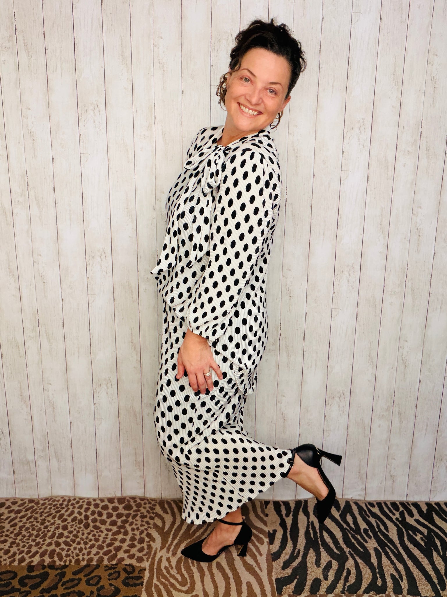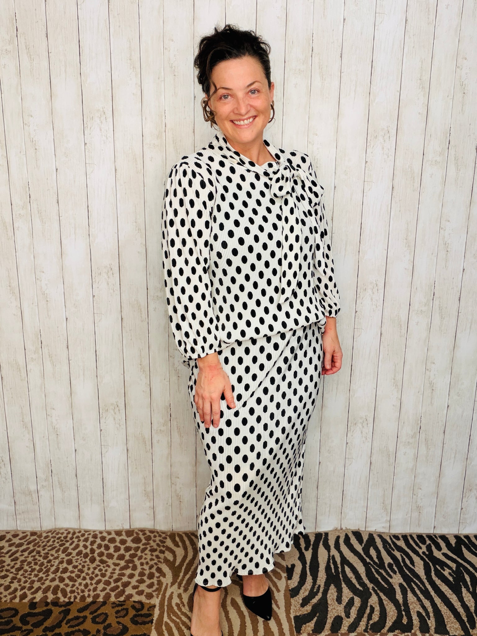 "Embrace effortless chic with our Bethany Bow Tie Top. Featuring a tie neck and 3/4 length sleeves with elastic, this modest tunic top boasts a roomy and rounded hemline for ultimate comfort. Made from a bodre material, slightly pleated for a unique texture. Made with polyester for easy care."