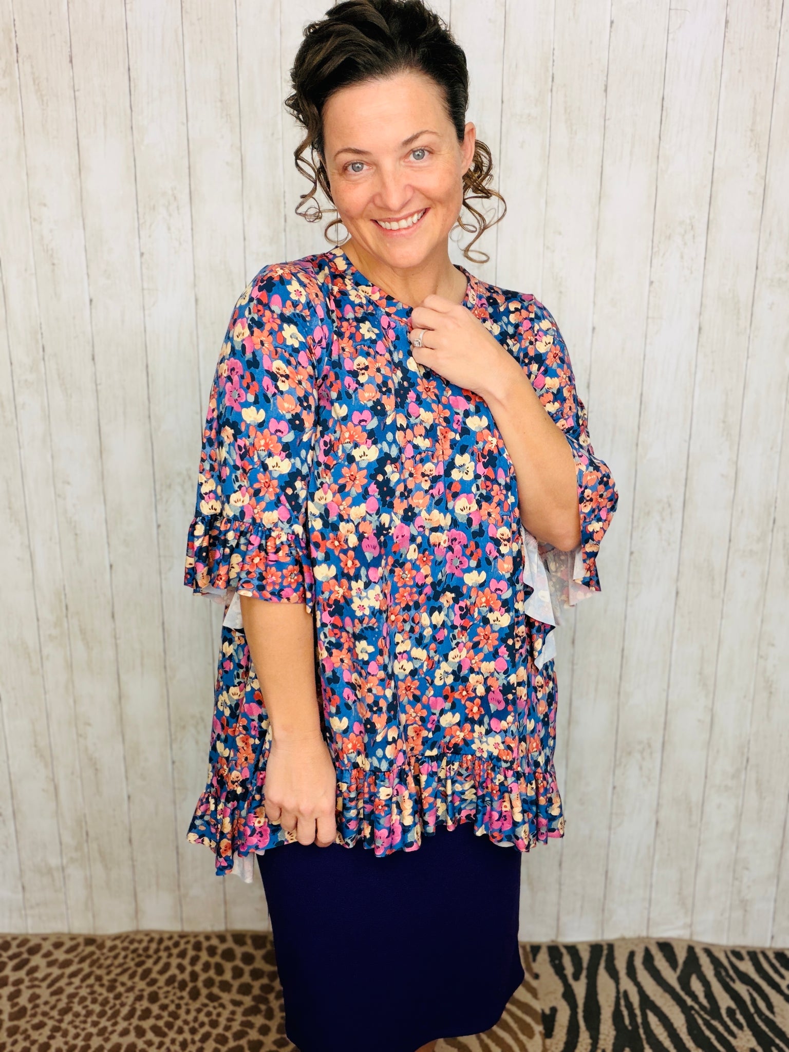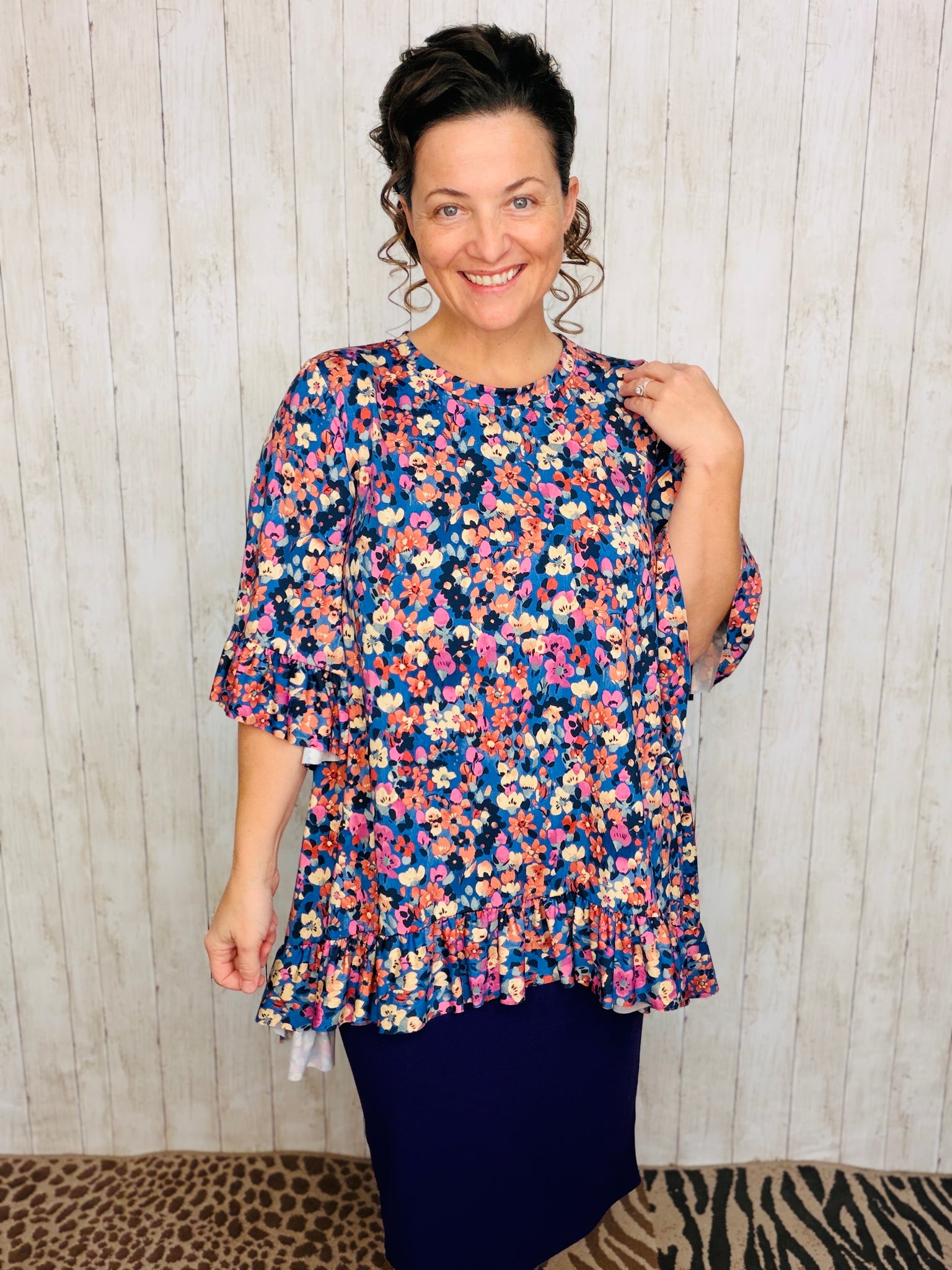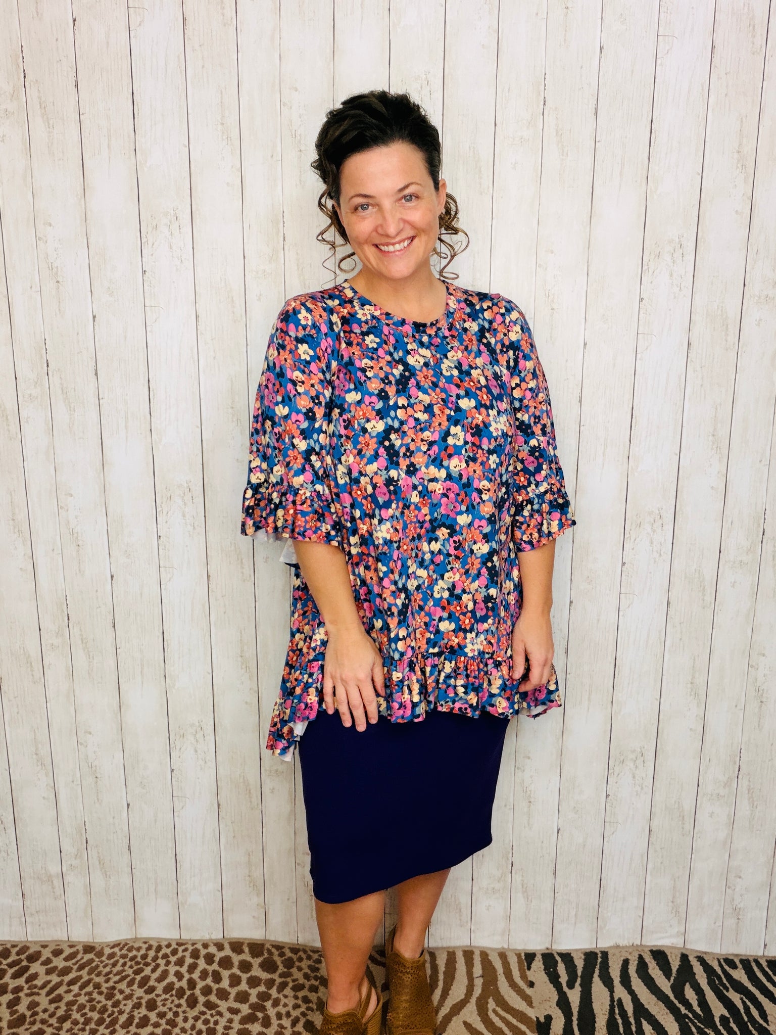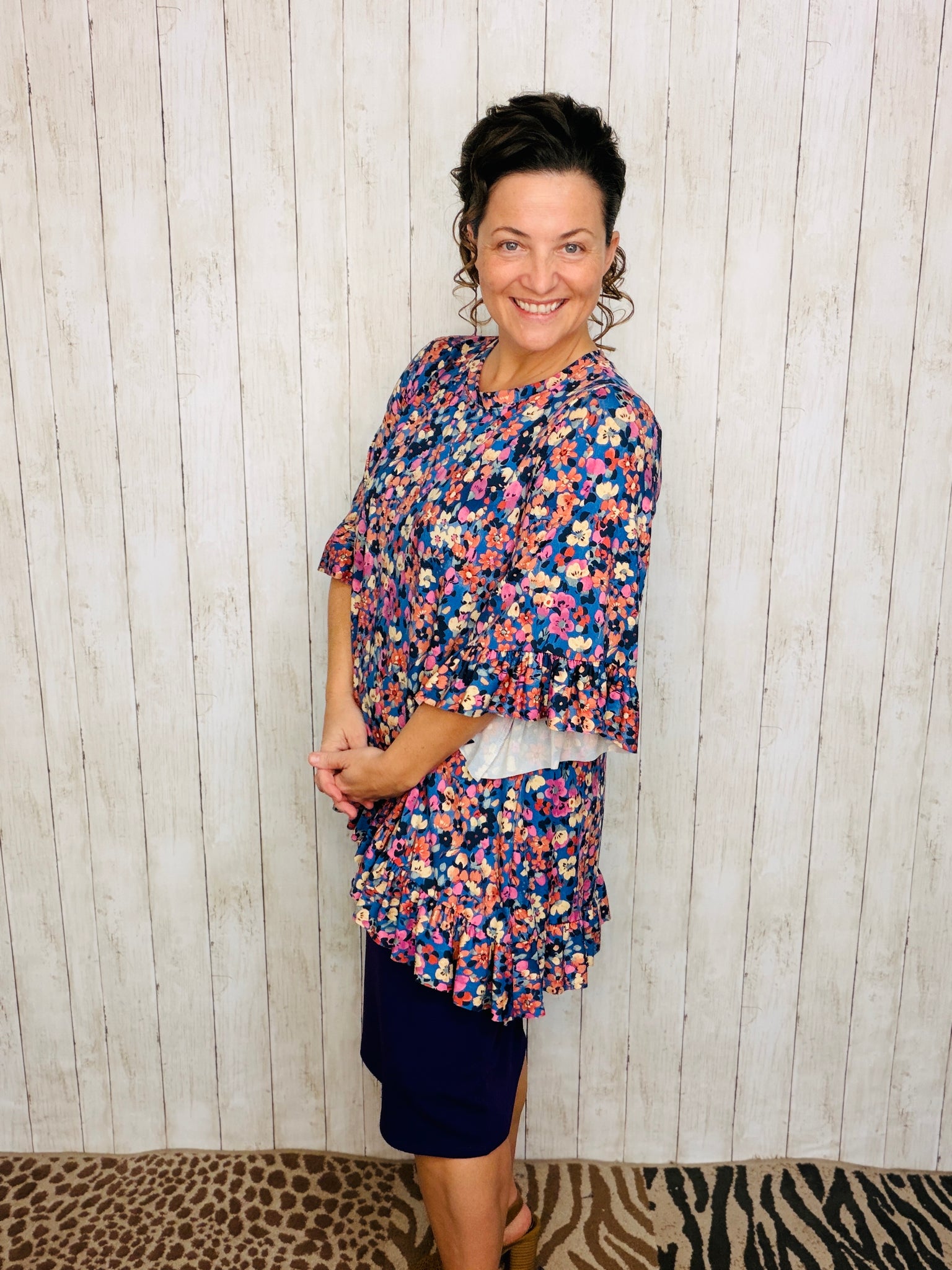 Samantha Ruffle High-Low Tunic offers style and practicality, with a beautiful floral anti-wrinkle finish and stretchy polyester and spandex blend fabric for a comfortable fit. This unique tunic is wash and wear and looks fantastic when paired with pencil skirts, making it a great choice for any wardrobe.