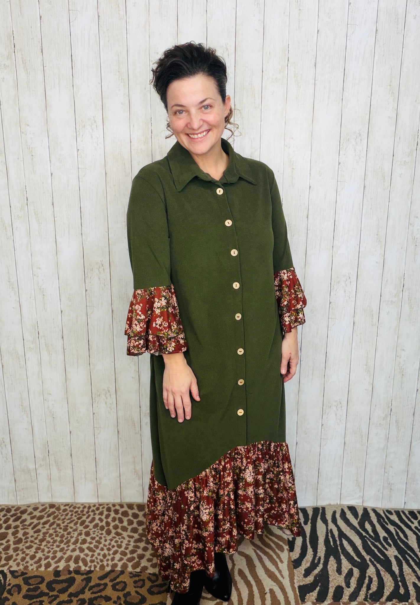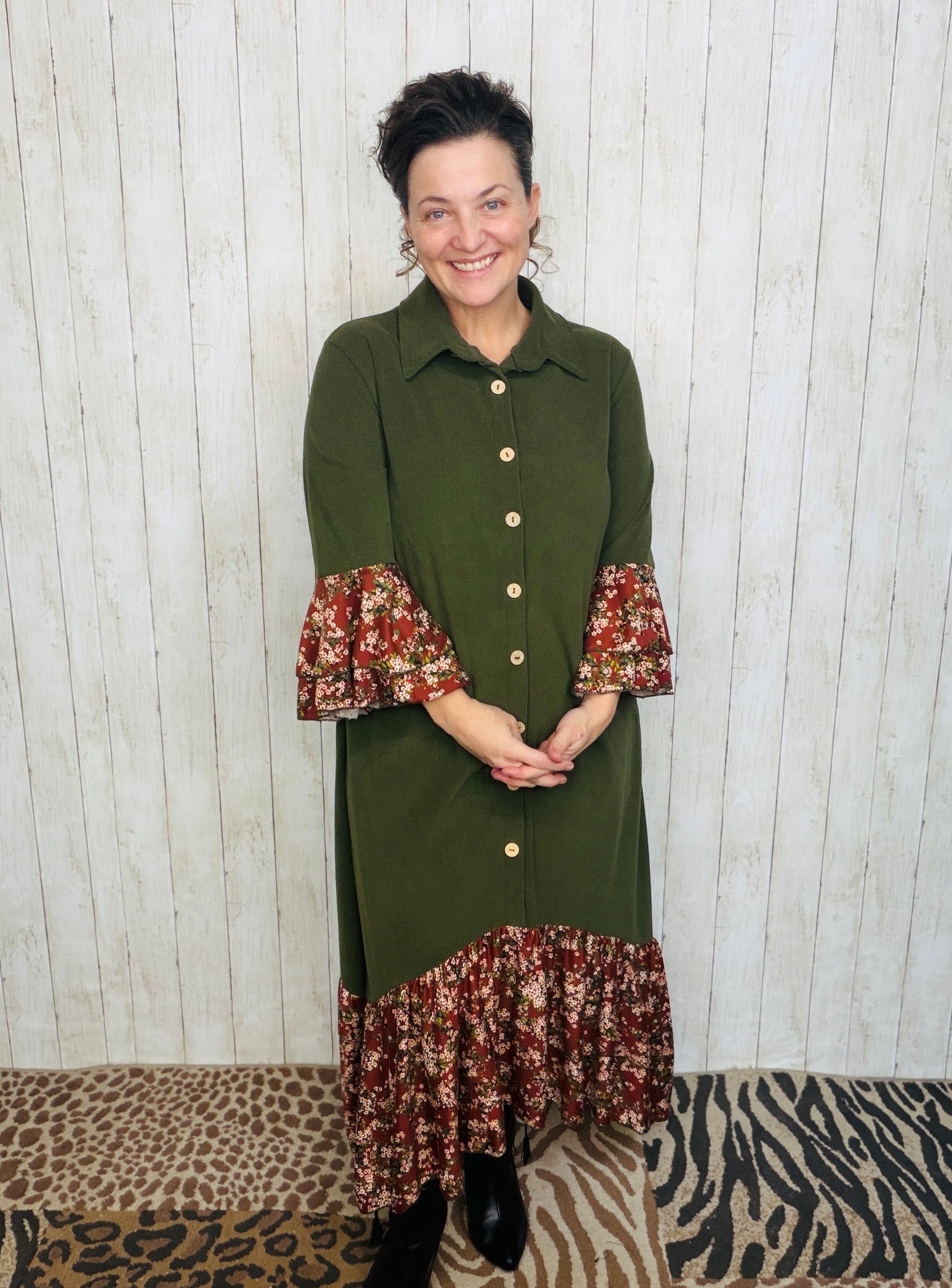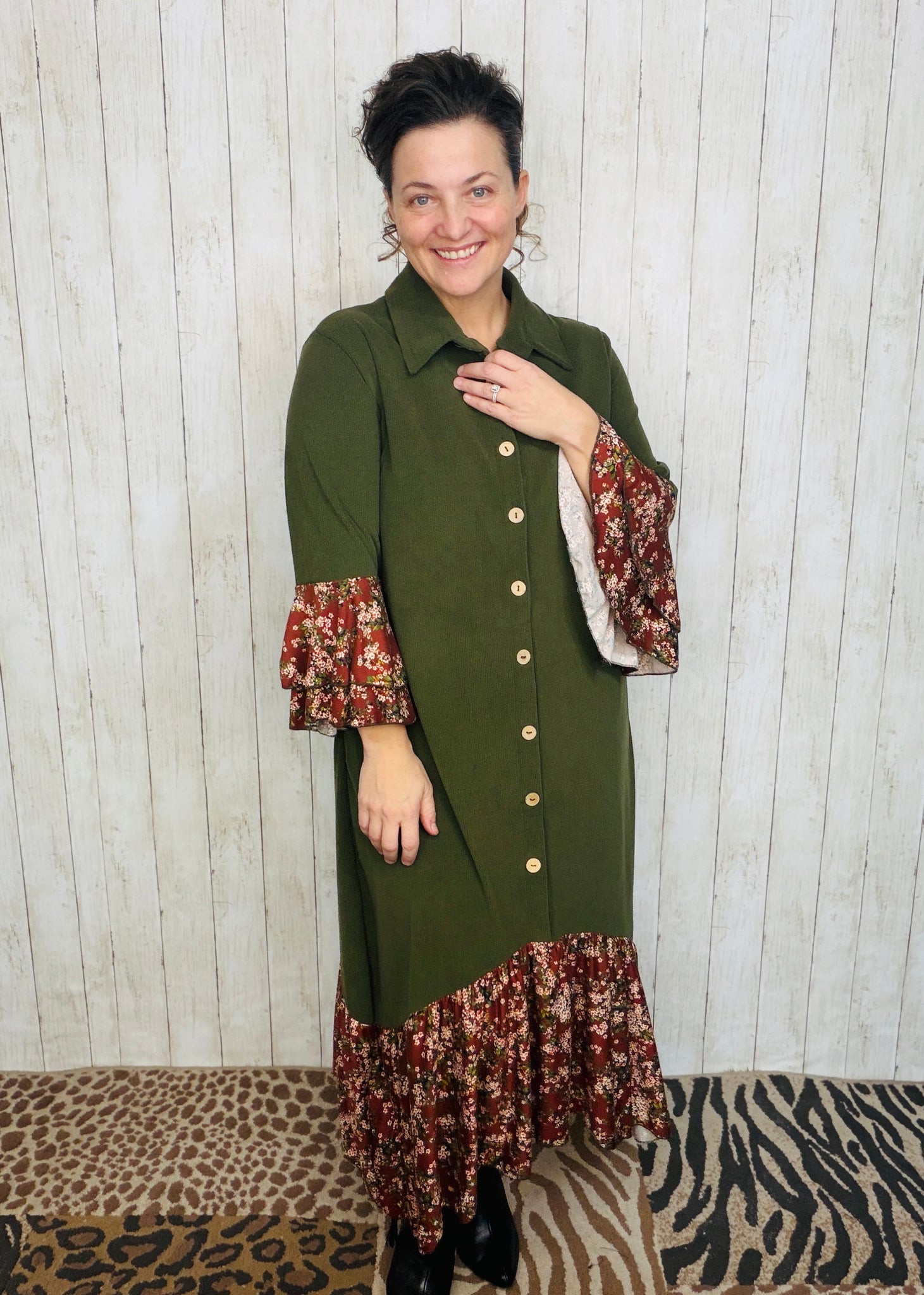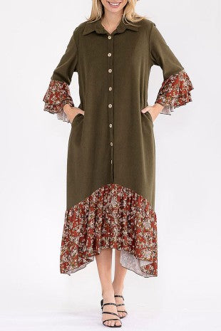 The Cammie Button Front Dress combines timeless elegance with modern comfort. Crafted from a stretchy polyester and spandex blend, this piece features a flattering silhouette that moves with you. The button front closure adds versatile styling options, while voluminous bell sleeves create an effortlessly chic aesthetic. Animal print contrast detailing elevates the design with visual interest, making it equally suited for refined occasions or elevated everyday wear.